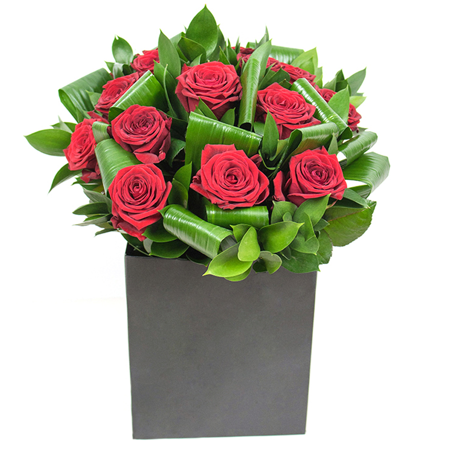 Immerse yourself in the grace and charm of our exquisite red rose arrangement. This bouquet seamlessly combines vibrant red roses with lush aspidistra leaves and delicate ruscus, creating a visually stunning centerpiece for any home.