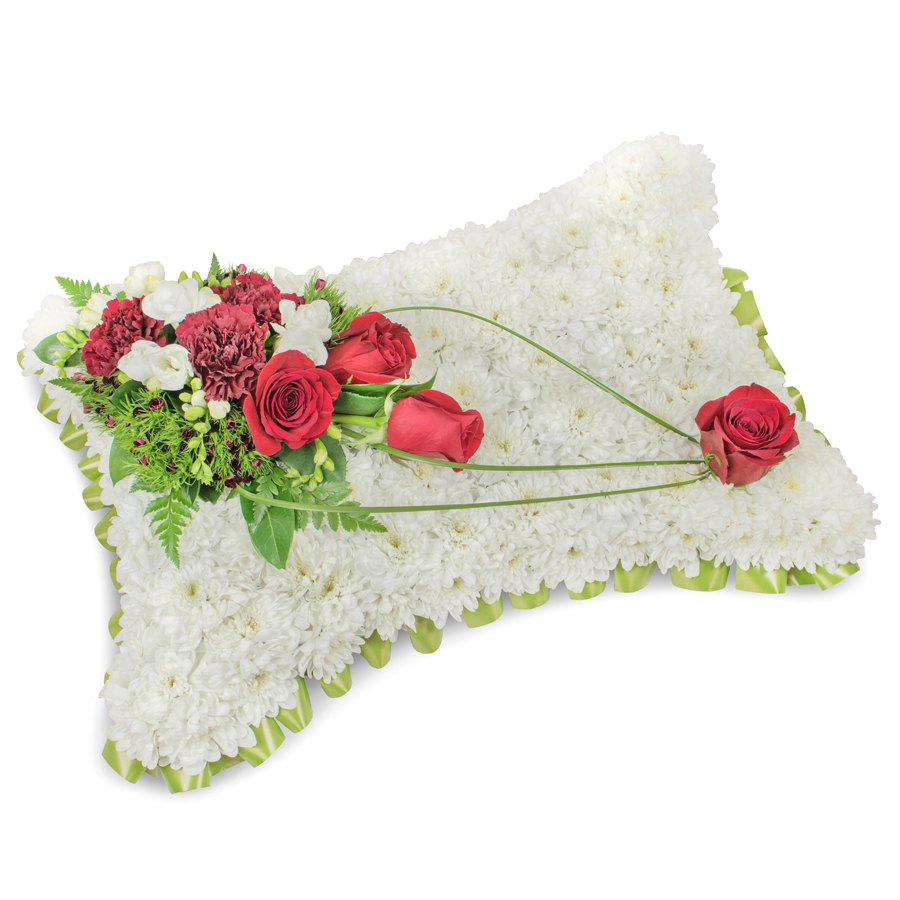 Express your heartfelt condolences with our classic bouquet featuring white chrysanthemums, bold red roses, white freesias, dark red carnations, delicate dianthus, and soft bear grass.